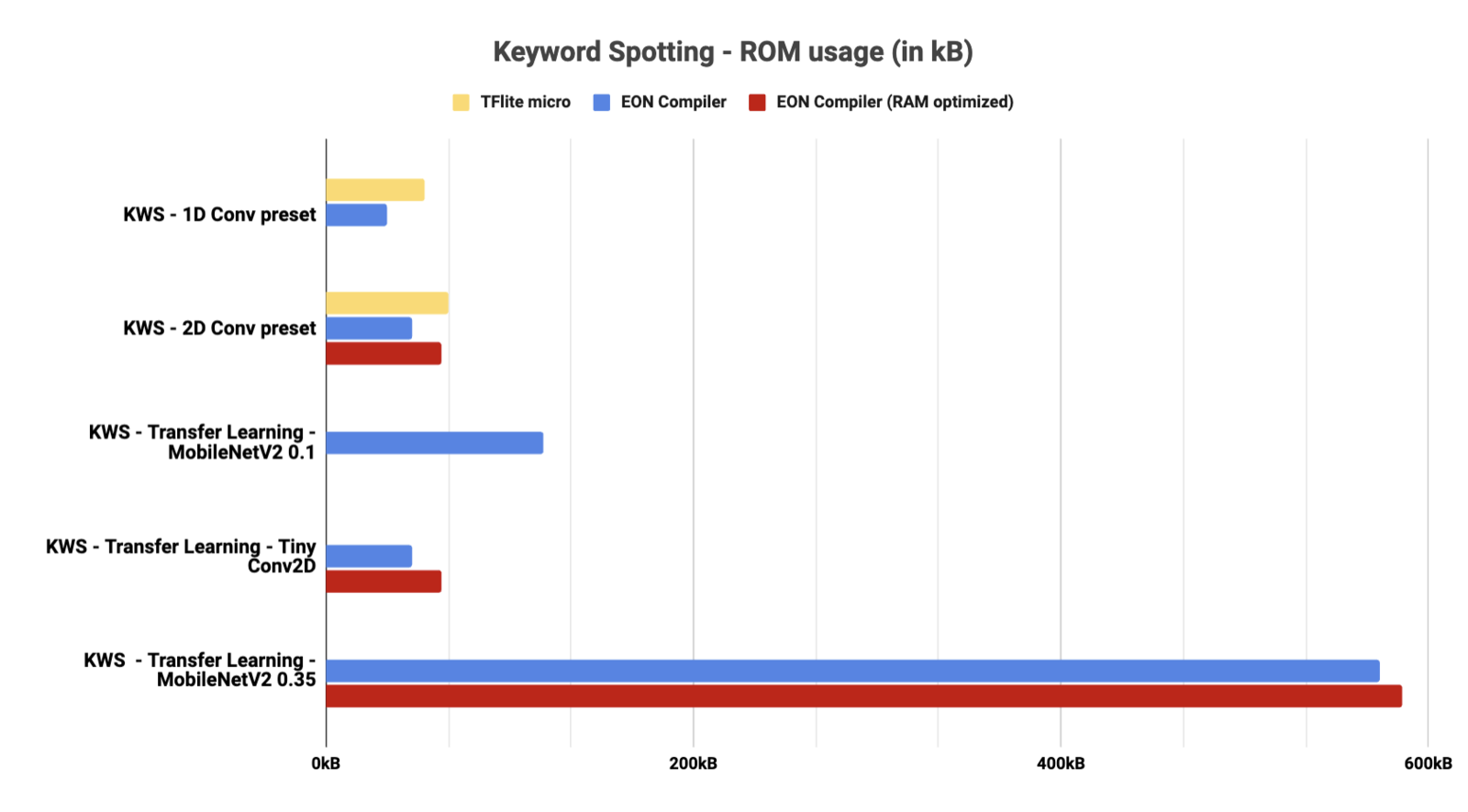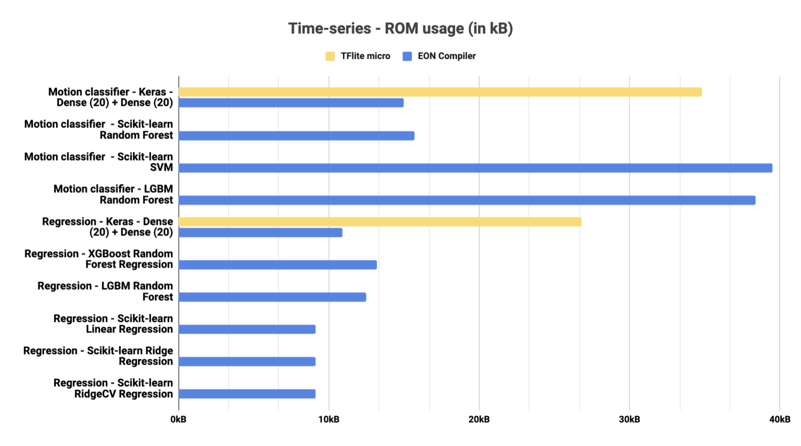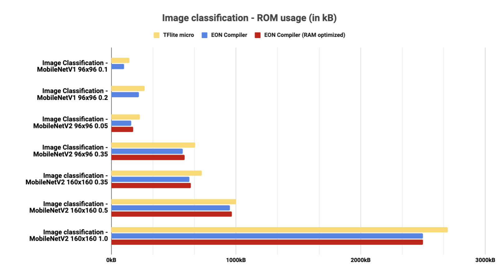 The input of the EON compiler is a LiteRT (previously Tensorflow Lite) Flatbuffer file containing model weights. The output is a .cpp and .h files containing unpacked model weights and functions to prepare and run the model inference. Regular Tflite Micro is based on LiteRT (previously Tensorflow Lite) and contains all the necessary instruments for reading the model weights in Flatbuffer format (which is the content of .tflite file), constructing the inference graph, planning the memory allocation for tensors/data, executing the initialization, preparation and finally invoking the operators in the inference graph to get the inference results. The advantage of using the traditional Tflite Micro approach is very versatile and flexible. The disadvantage is that all the code for getting the model ready on the device is pretty heavy for embedded systems. To overcome these limitations, our solution involves performing resource-intensive tasks, such as reading the model from Flatbuffer, constructing the graph, and planning memory allocation directly on our servers. Subsequently, the EON compiler performs the generation of C++ files, housing the necessary functions for the Init, Prepare, and Invoke stages. These C++ files can then be deployed on the embedded systems, alleviating the computational burden on those devices. The EON Compiler (RAM Optimized) option adds, on top of the above, a novel approach by computing values directly as needed and minimizing the storage of intermediate results. This method leads to a significant decrease in RAM usage - sometimes at the cost of a slightly higher latency/flash - without impacting the accuracy of model predictions. In practice, we demonstrated this with our default 2D convolutional model for visual applications. By slicing the model graph into smaller segments, we managed to reduce the RAM usage significantly — by as much as 40 to 65% compared to LiteRT (previously Tensorflow Lite) — without altering the accuracy or integrity of the model’s predictions.Limitations