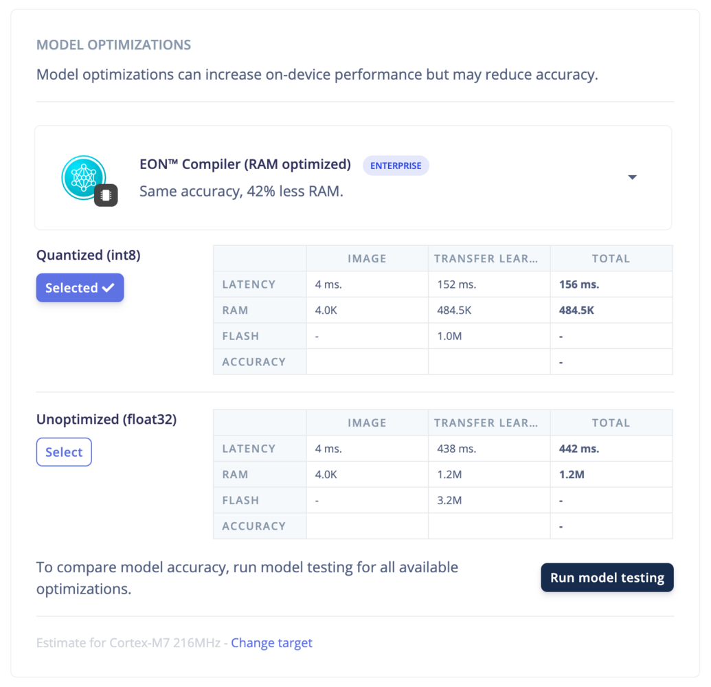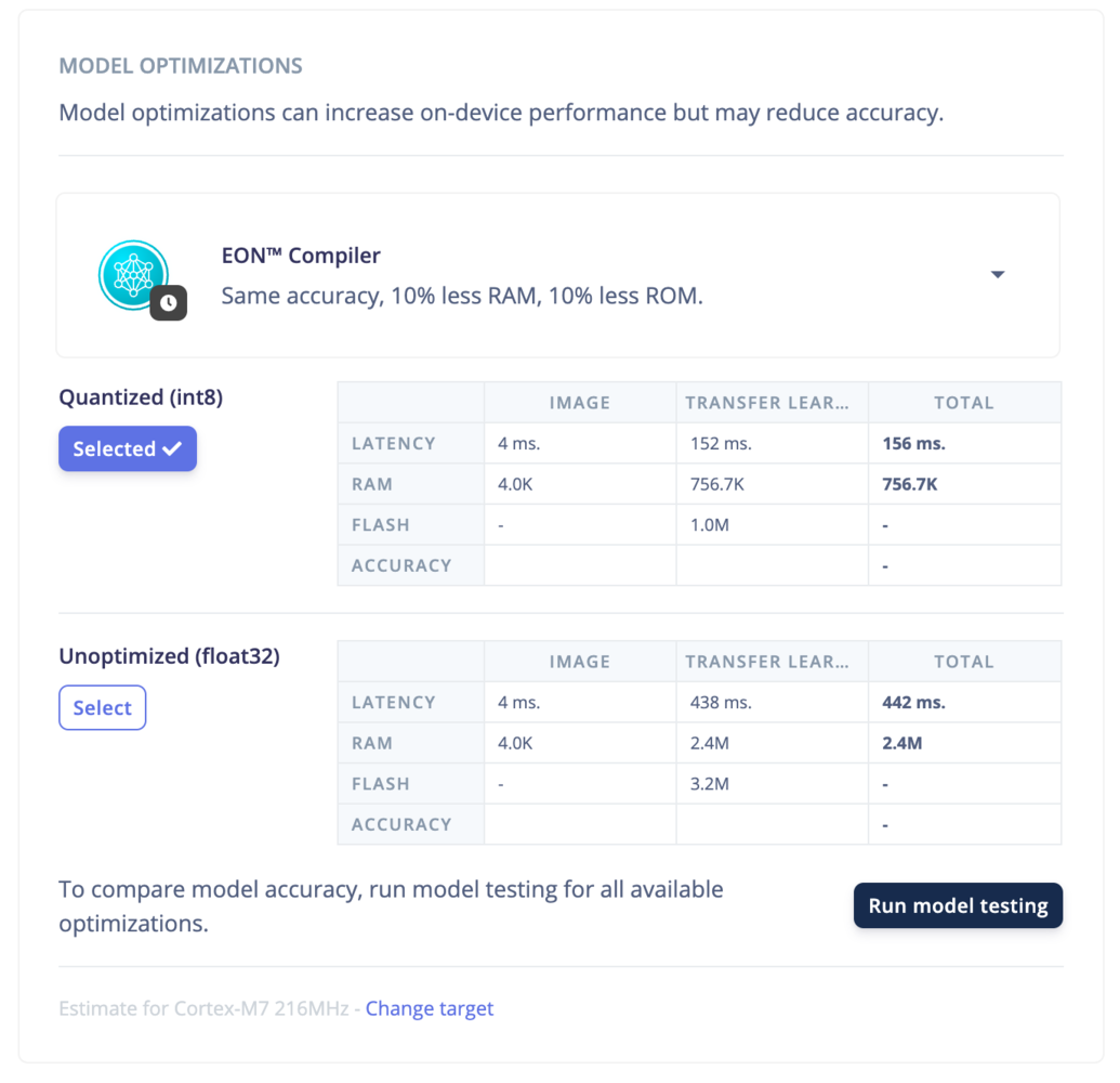 - Processing blocks: Here we can see the optimizations for the DSP components of the compiled model DSP components. e.g. Spectral Features, MFCC, FFT, Image, etc.