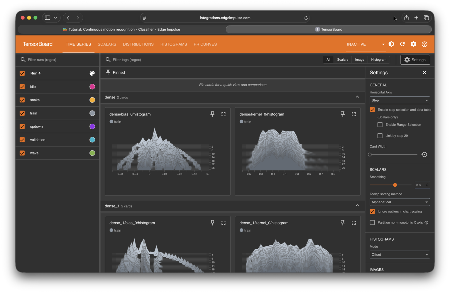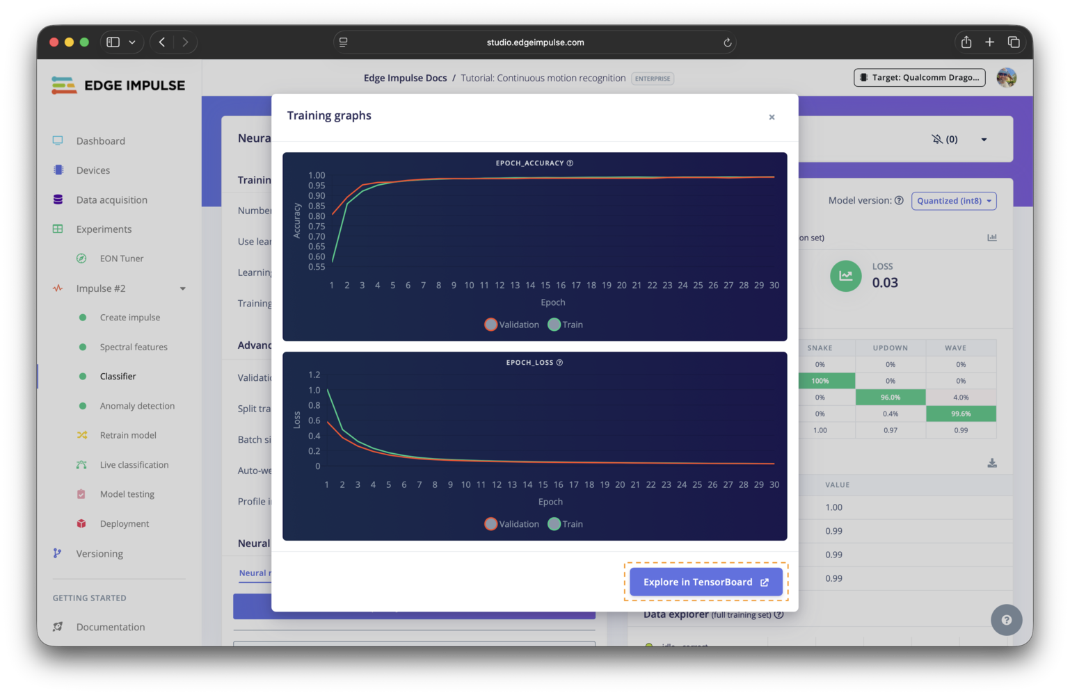 For a more detailed analysis of the model training process, you can use the TensorBoard integration. TensorBoard provides a suite of visualization tools to help you understand, debug, and optimize your model. To access TensorBoard, navigate to the learning block page, open the training graphs modal as described above, and click on theExplore in TensorBoard button at the bottom of the modal. This will launch a TensorBoard instance in a new tab, where you can explore various metrics, histograms, and other visualizations related to the training of your model.