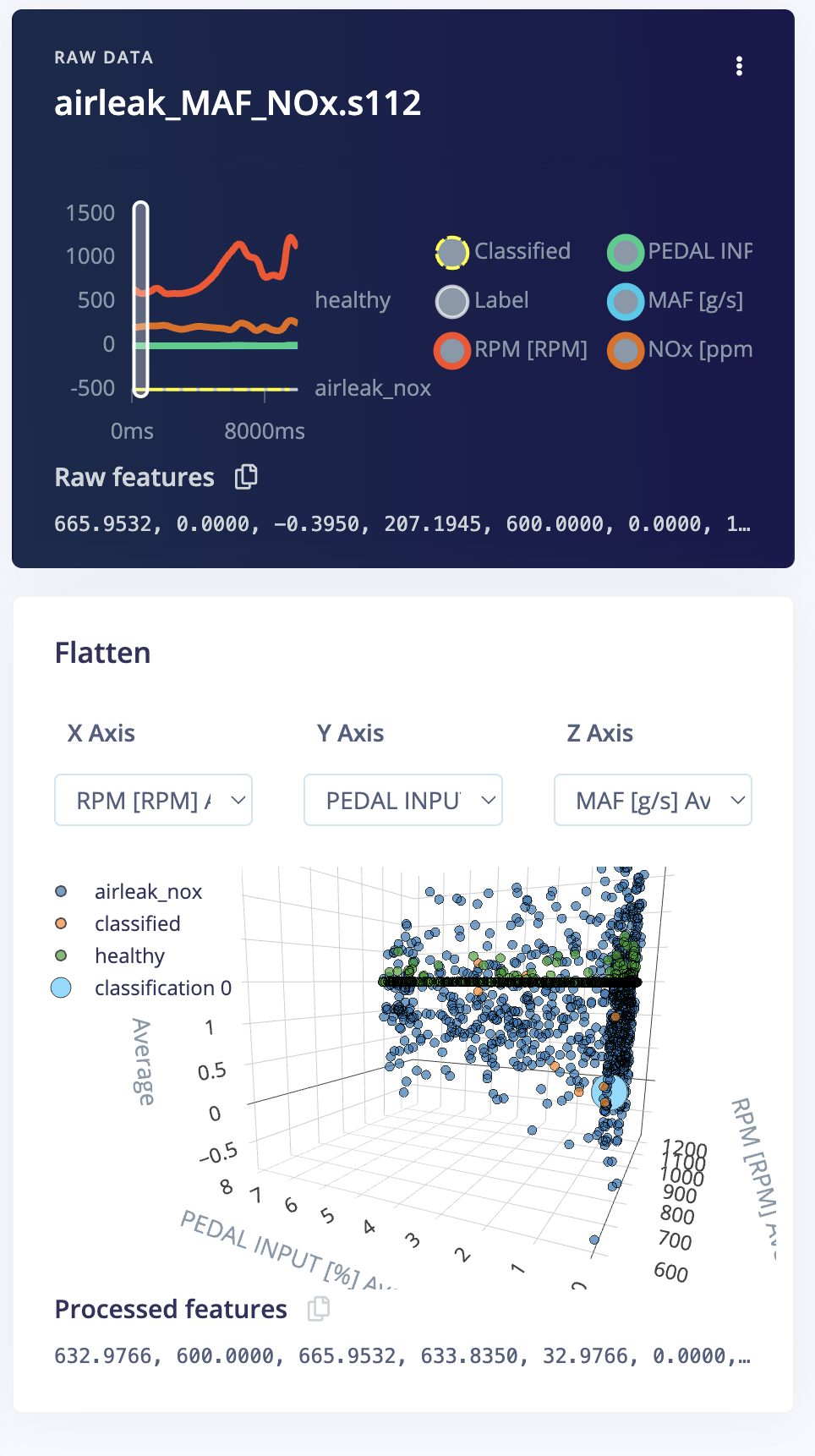 We’ll use a minimal, interpretable set (more can be added later):- MAF [g/s] : proxy for air mass entering the engine (load).