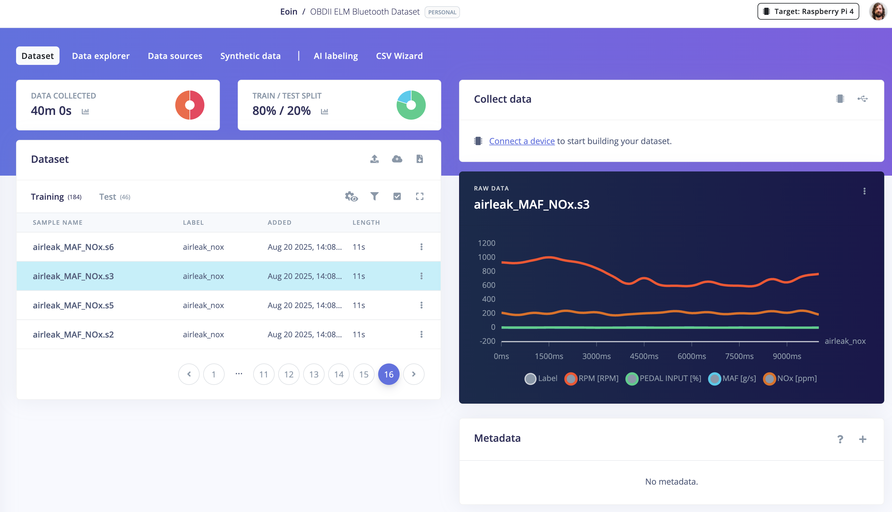 Take the sample CSV to get started or collect a sample from your OBD-II interface using your pi and the telemetry-obd project.The CSVs for the sample project have the following headings: