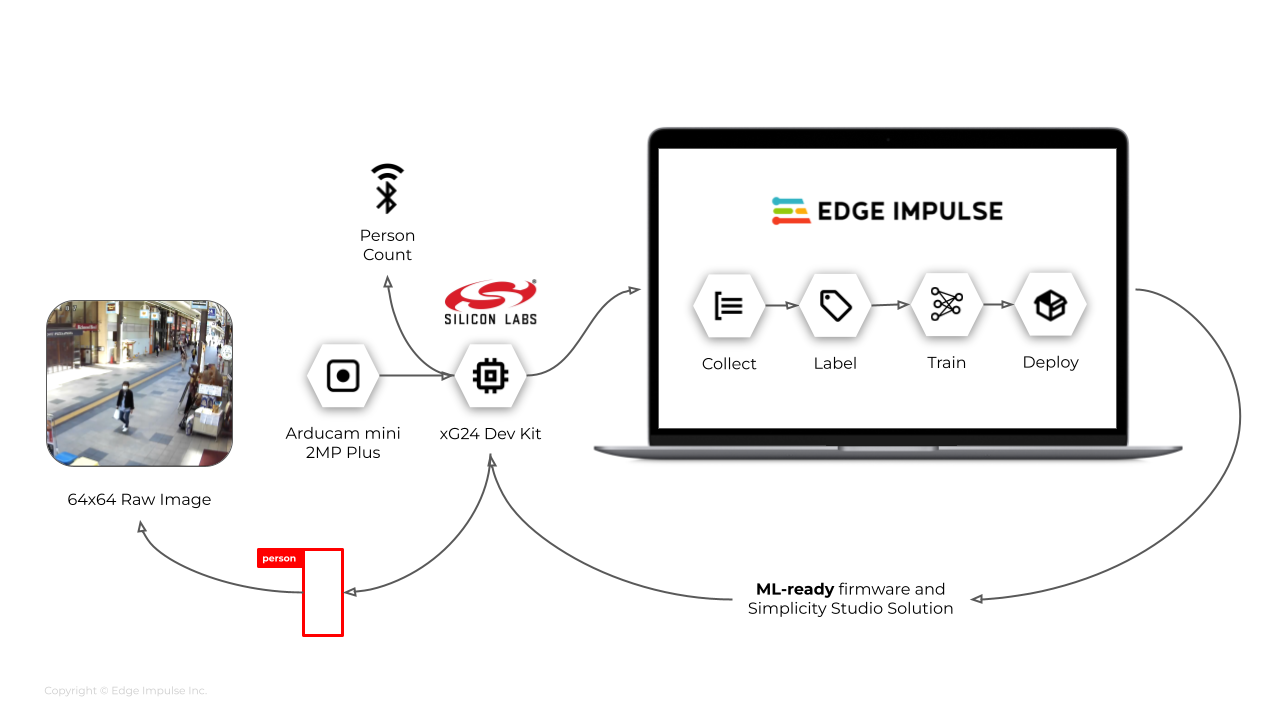 The diagram below depicts the ML lifecycle architecture defined for our people counting reference design. We used a single xG24 Dev Kit to implement either a collection or an inference flow, recursively as required, during the development process.Prerequisites