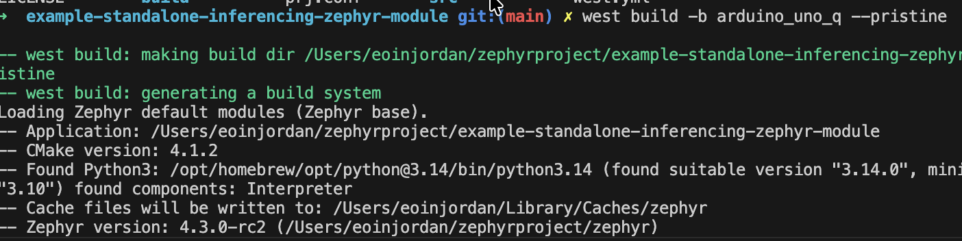 Open .west/config and set the board:The UNO Q shares its STM32U585 MCU architecture with the Uno Q, so arduino_uno_q is a working target until official uno_q Zephyr support is merged. See Zephyr docs for the latest here